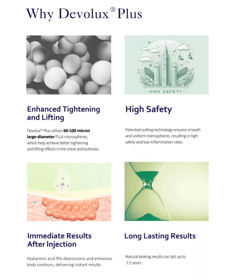 Devolux® is a synthetic, biodegradable injectable fillers, which is composed of microparticle beads of poly-L-lactic acid (PLLA). PLLA is a biocompatible, biodegradable, synthetic polymer, which is a derivative of the alpha hydroxy acid family. Devolux® treats the visible signs of aging on the face, by restoring lost facial volume, and treating shallow and deep facial lines. The mechanism of action of Devolux® works by stimulating the body to induce collagen production. Devolux® injections create new collagen and elastin in the skin, firm and tighten the skin, and restore lost volume. GranCross Technology™ Comparing with 10-100μm particle size of traditional poly-L-lactic acid, Devolux® is crafted by innovative GranCross Technology™ of a smaller 3-5μm particle size. This can help Devolux® fully diluted within 5 minutes, and effective prevent nodules and papules after the treatment.